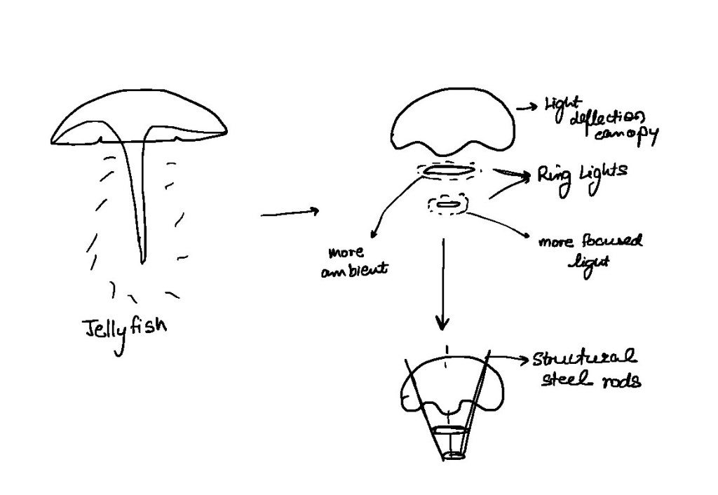 The “Jellyfish” light fixture takes inspiration from the real-life jellyfish and translates its natural form into an abstracted design. The fixture abstracts the tentacle-like strands into ring lights that hang down along with a canopy made of a mesh metal which helps emanate a soft, ambient glow, mimicking the mesmerizing movement of jellyfish in the ocean.